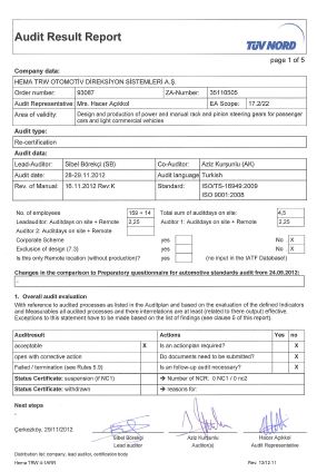 HEMA TRW ISO/TS 16949 TÜV NORD Denetiminden Başarıyla Geçmiştir (29 Kasım 2012)